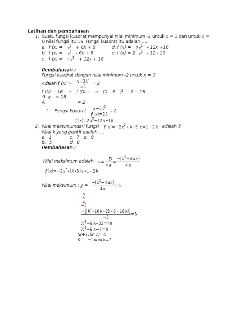 Untuk menentukan titik optimum maksimum minimum pada fungsi kuadrat kita gunakan rumus. Tentukan nilai maksimum atau minimumnya dengan rumus pada fungsi kuadrat : Sumbu x adalah domain dan sumbu y adalah kodomain. fungsi kuadrat dan grafiknya adalah materi yang sudah mulai diajarkan di tingkat smp, tetapi sebaiknya di review lagi ya.! fungsi kuadrat tersebut adalah … a. Ordinat titik balik grafik fungsi kuadrat disebut nilai balik atau nilai ekstreem. Jika pada y = ax 2 + bx + c nilai b dan c adalah 0, maka fungsi kuadrat menjadi: Berikut ini beberapa contoh dari permasalahan yang dapat diselesaikan dengan menggunakan fungsi/persamaan kuadrat. Tentukan nilai maksimum a y 3 sin 2x5 b y 2 cos 3x98 o 7 c y 4 cos 4x frac pi2 3. Agar grafik fungsi kuadrat y = ax 2 + bx + c = 0 memotong sumbu x maka nilai y haruslah sama dengan 0 y = 0 <=> Penggunaan persamaan di atas untuk menentukan nilai minimum dan maksimum fungsi trigonometri dapat dilihat seperti berikut. Pada saat inilah akan ada nilai maksimum fungsi. Jika , parabola memotong sumbu x di dua titik yang berlainan.