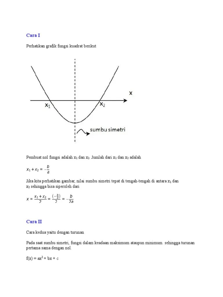 Selanjutnya fungsi trigonometri dasar di atas dikembangkan menjadi fungsi trigonometri sederhana, sehingga terjadi perubahan nilai maksimum, nilai minimum dan perioda fungsi Untuk memudahkan mempelajari materi ini, sebaiknya baca materi "turunan. nilai optimum dari suatu fungsi kuadrat sama dengan nilai , maka nilai optimumnya dapat ditentukan dengan menggunakan rumus. Pada saat inilah akan ada nilai maksimum fungsi. Ordinat titik balik grafik fungsi kuadrat disebut nilai balik atau nilai ekstreem.